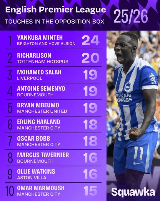 华体会官方网站首页-英超前三轮禁区触球榜:明特第一里沙利松第二,曼城3人上榜